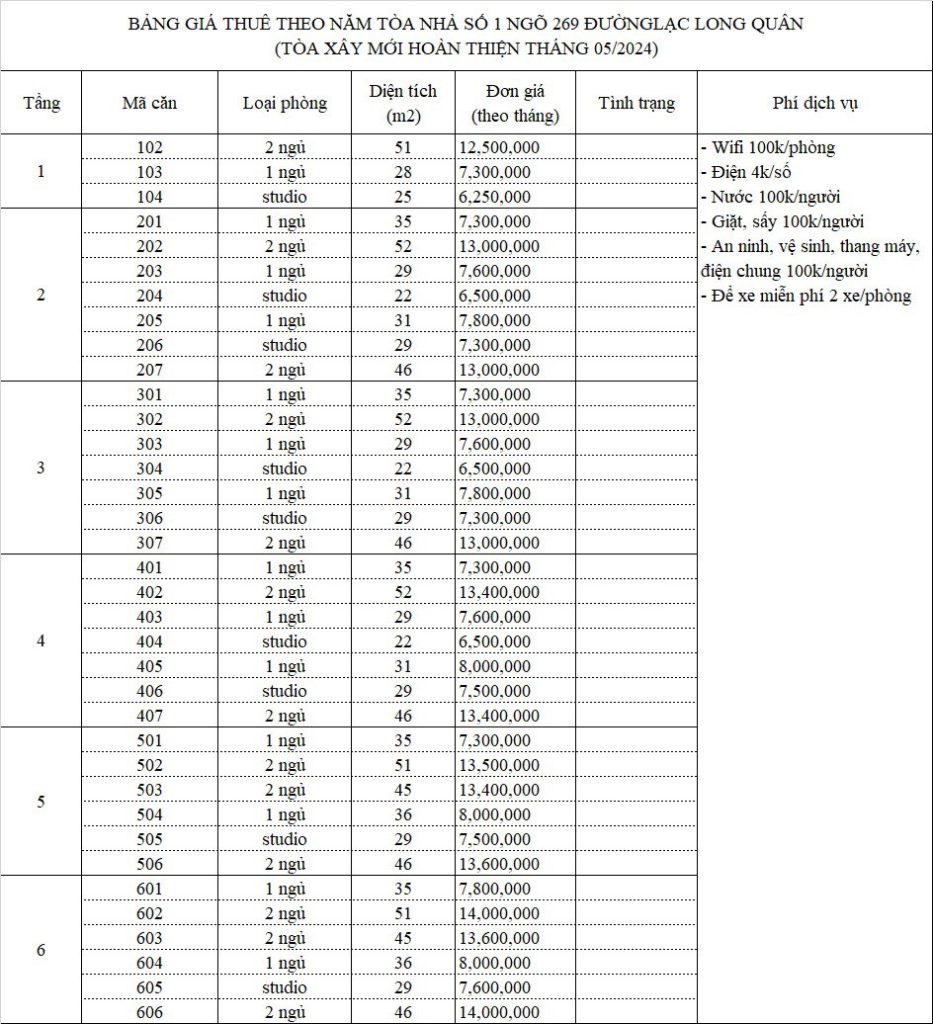 – An ninh, vệ sinh, thang máy, điện chung 100k/người