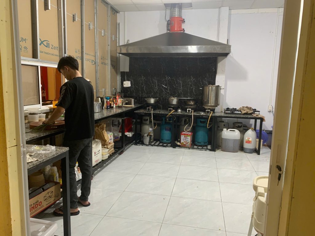 – Bếp: chân khung sắt, mặt đá hoa cương