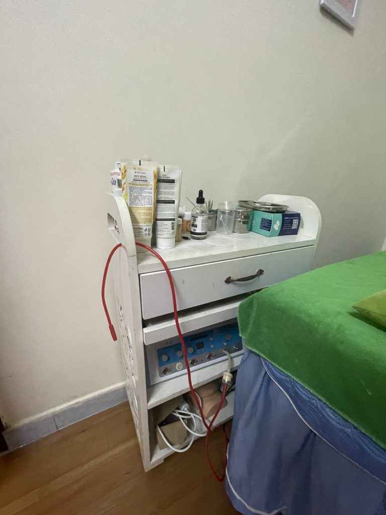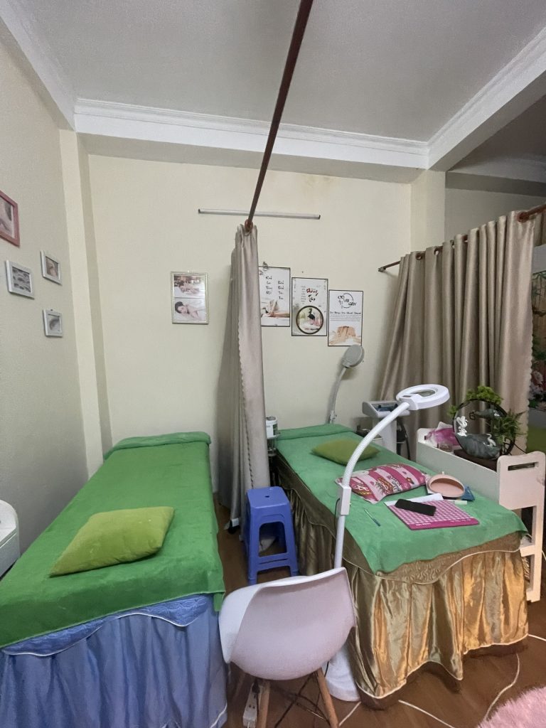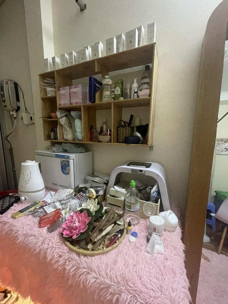 – Mình có sẵn tủ hấp khăn, may lạnh, đá bóng, 2 máy xông hơi mụn, máy massage bụng, 3 giường spa 1 giường dưỡng sinh, tất cả thiết bị spa mi, nail,…