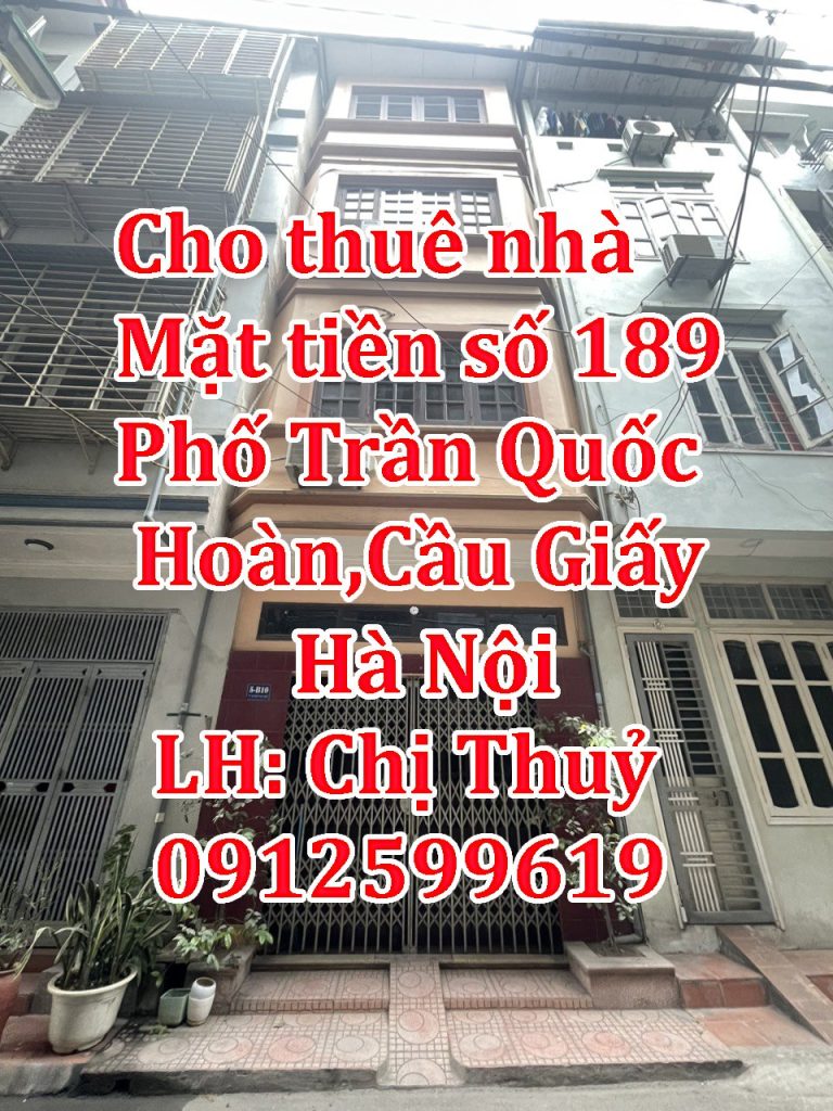 Cho thuê nhà mặt tiền số 189  hướng Tây Bắc mặt tiền Phố Trần Quốc Hoàn,Cầu Giấy, Hà Nội. Mặt sau nhà hướng Đông Nam là mặt ngõ thuộc tập thể ĐH Sư Phạm Hà Nội