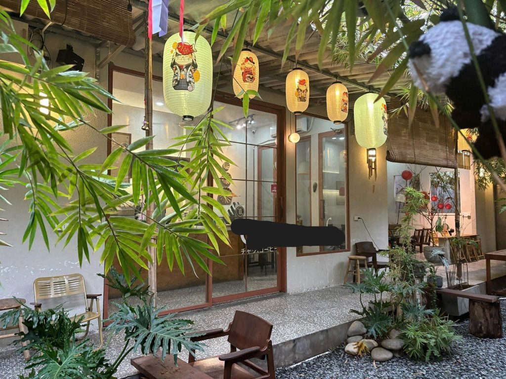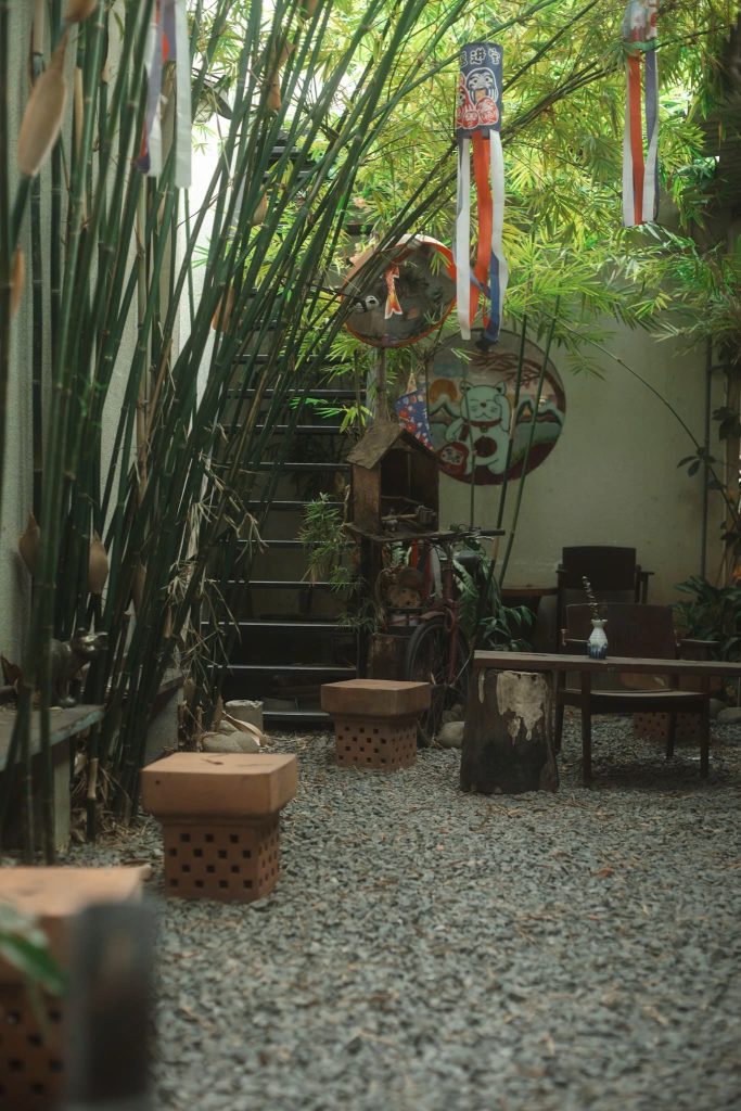 Khu sân vườn Nhật Bản: cây xanh, hồ cá, bàn đá – không gian thư giãn, sống ảo, rất hút khách.